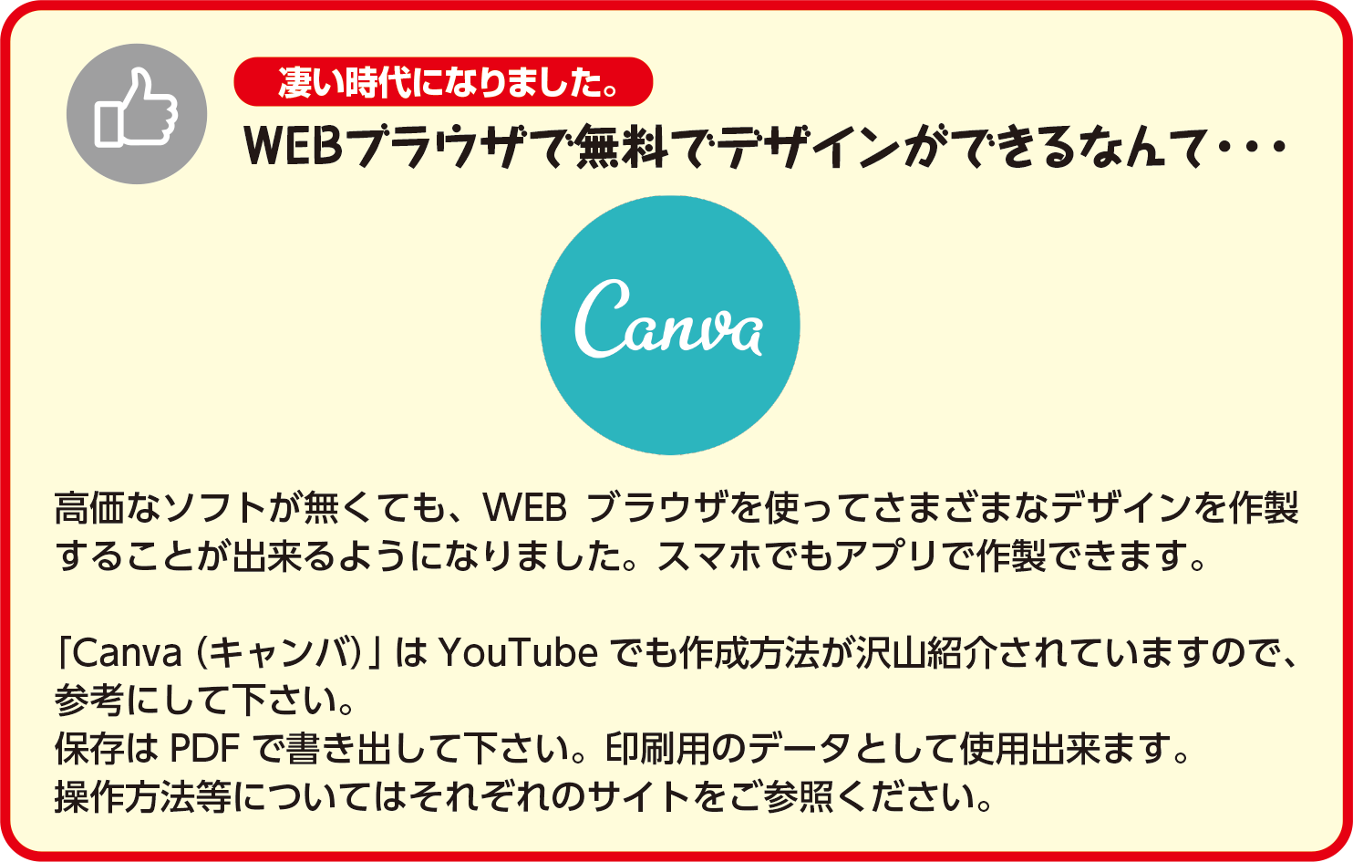 「Canva(キャンバ)」はYouTubeでも作成方法が沢山紹介されていますので、参考にして下さい。