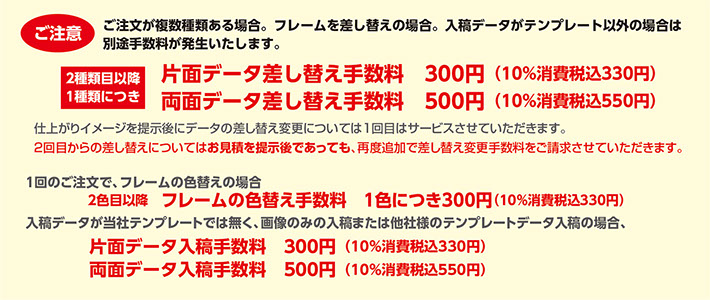 ご注文が複数種類ある場合。フレームを差し替えの場合。入稿データがテンプレート以外の場合は別途手数料が発生いたします。